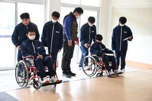 その後、体育館に移動し、社会福祉協議会の方を講師としてお招きして、グループに分かれて学校内を車いすで移動する体験をしました。普段生活している学校を車いすで移動したり、多目的トイレを利用したりする中で、「思っていたよりも大変だった」「スロープを後ろ向きに降りるのは怖かった」など、さまざまな気づきや感想がありました。