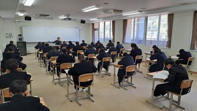 新入生テストを実施しました。テストの様式も変わり、慣れない中で最後までやりきることができました。テストの受け方や問題の難しさに戸惑いながらも、黙々と問題を解いていました。上級生にも負けない、明るく元気な号令が校舎の中に響いていました。