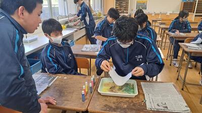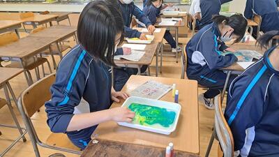 写真は9年生の『マーブリング(墨流し)』の様子です。