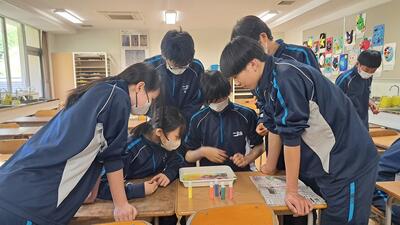 今日の美術の授業で、7年生は『レタリング』、8年生は『遠近法』、9年生は『マーブリング(墨流し)』について学びました。