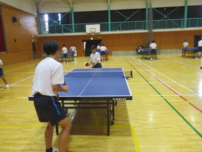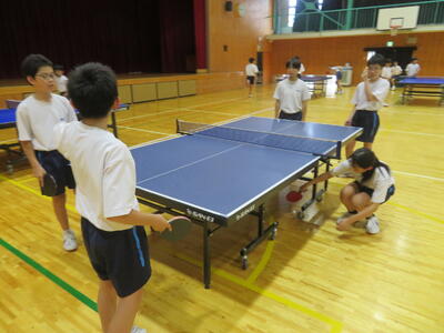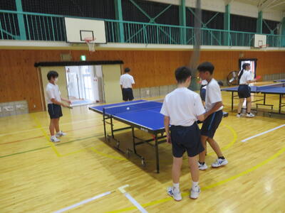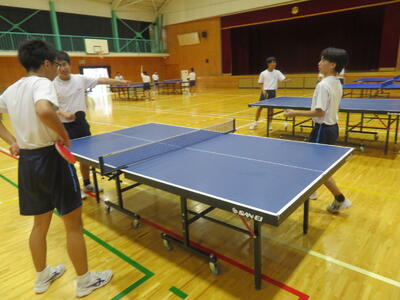 体育で卓球の授業をしていますが、生徒たちはラリーを楽しみながら、笑顔と真剣な表情が交差する、活気あふれる体育の時間です。