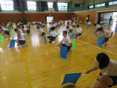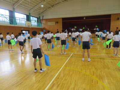 8月26日(火)、生徒会執行部の人たちが、体育祭のマスゲームで行う旗体操とダンスの練習をしました。