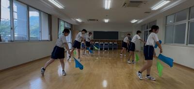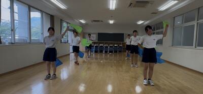 8月26日(火)、生徒会執行部の人たちが、体育祭のマスゲームで行う旗体操とダンスの練習をしました。