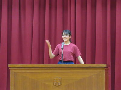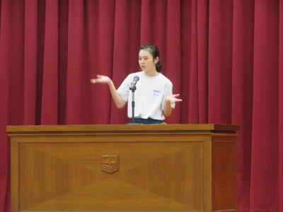 30日(火)に宍粟市長杯英語スピーチコンテストに出場する9年生の高品まゆきさんと片山紗那さんが練習してきたスピーチを全校生の前で披露してくれました。早くからスピーチの原稿の手直しや、発音の練習、ジェスチャーなどを一生懸命練習してきた成果を発揮してくれました。